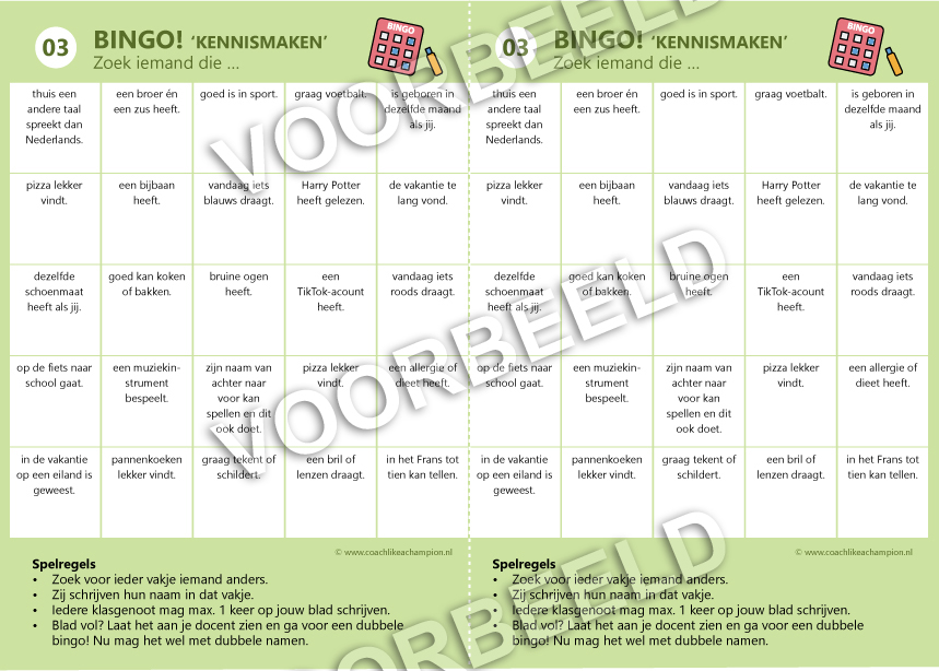 Met het BINGO ‘Kennismaken’ leren leerlingen elkaar op een leuke manier kennen. Tijd: 15 – 20 minuten.